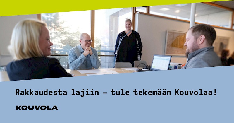 Tarjoamme kilpailukykyiset palvelussuhteen ehdot, hyvät henkilöstöedut (mm. Epassi) sekä mielekkään työympäristön. Meillä on osittainen mahdollisuus etätyöhön, mikä helpottaa työn ja perhe-elämän yhteensovittamista. Henkilöstön työhyvinvointia ja osaamista kehitetään suunnitelmallisesti. Kouvolan kaupungin asukkaille tuottaa palveluja noin 2 700 työntekijää. Tärkein tavoitteemme työssämme on halu toimia kaupunkilaisten parhaaksi. Henkilöstövisiomme on: Rakkaudesta lajiin - me teemme Kouvolaa!